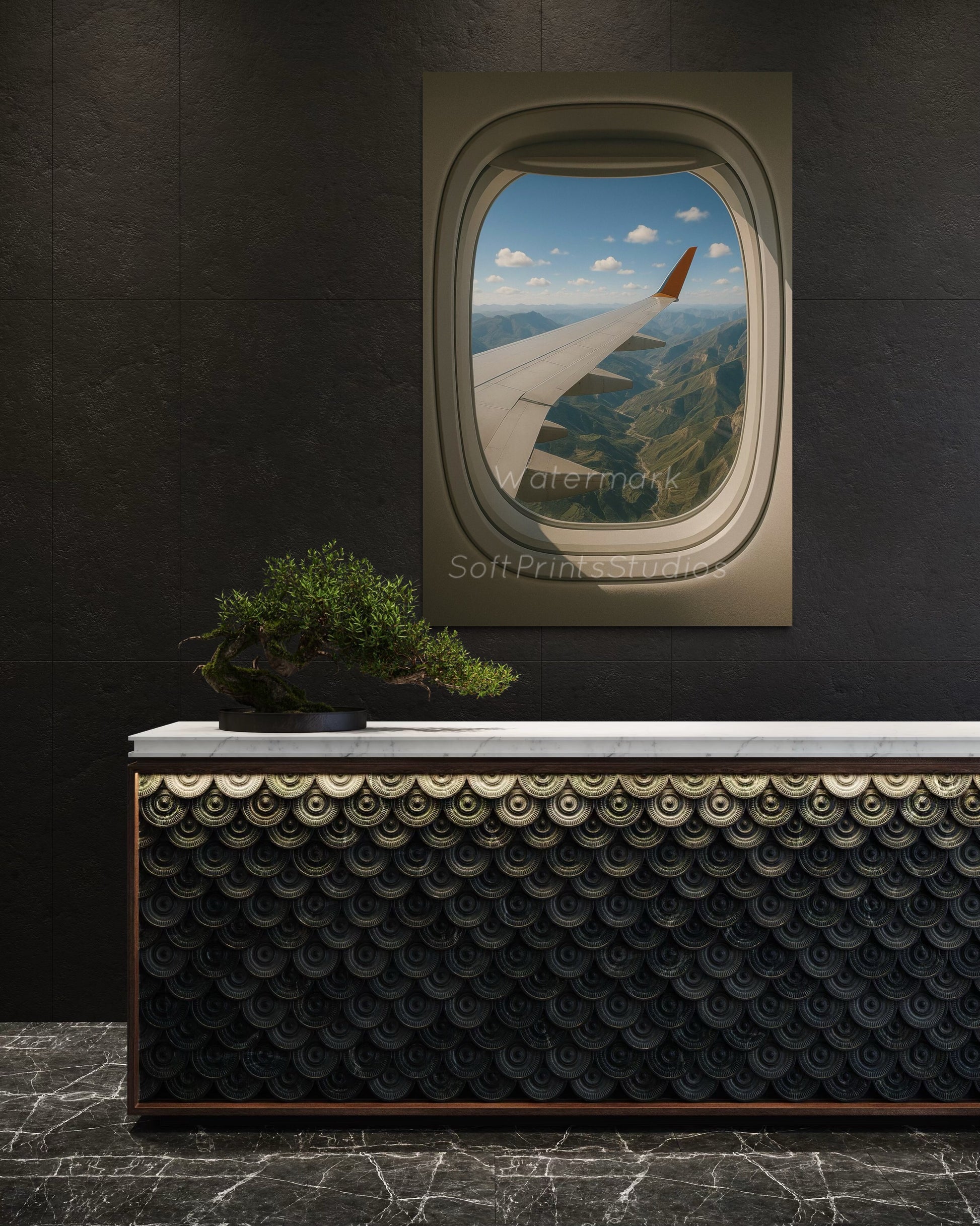 Airplane window view over green valleys and layered mountains. A stunning travel wall art print for adventurers, explorers, and aviation lovers.