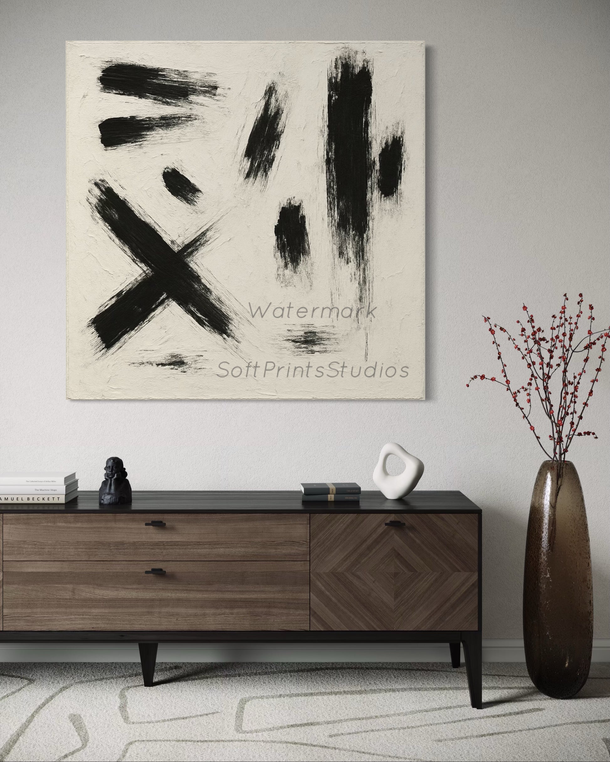 Modern abstract brushstroke wall art in black on textured white. A minimalist design that adds bold style to Scandinavian, contemporary, or gallery-inspired décor.