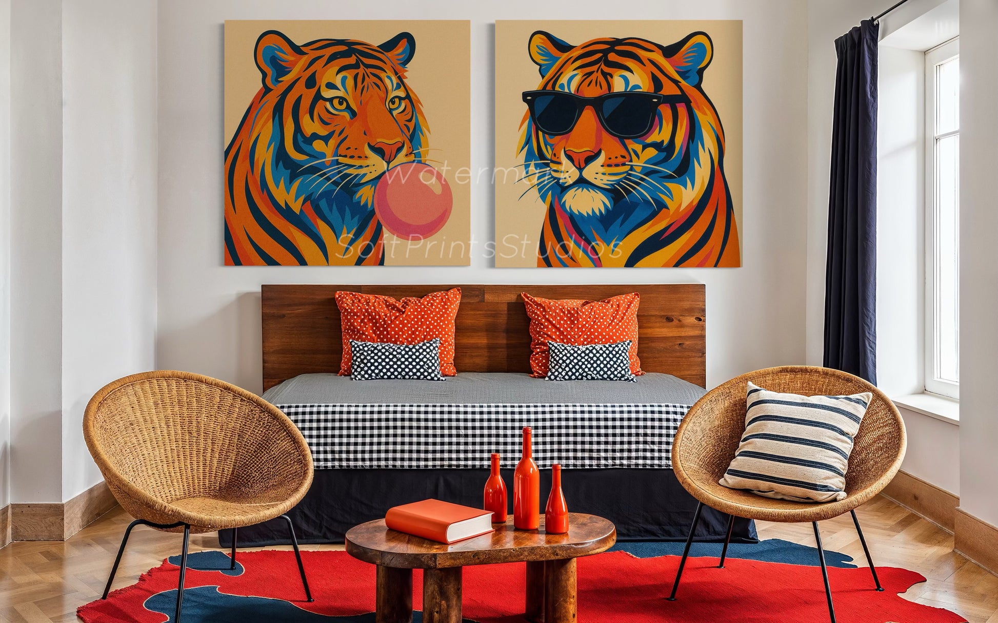 Cool tiger wall art in pop art style. Bright and modern animal print with sunglasses, perfect for bedrooms, living rooms, offices, or dorm décor.
