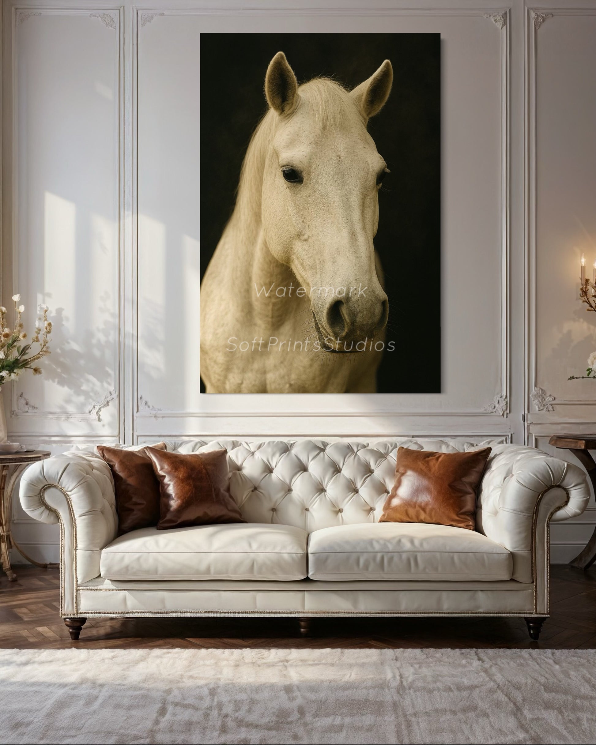Celebrate equestrian beauty with this elegant white horse wall art print—detailed portrait against a dark background, ideal for rustic or farmhouse décor.”